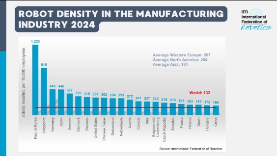 Asia has an average robot density of 131 units per 10,000 persons employed in manufacturing – an increase of 11%. The economies of the Republic of Korea, Singapore, Japan and Chinese Taipei are among the top ten most automated worldwide.